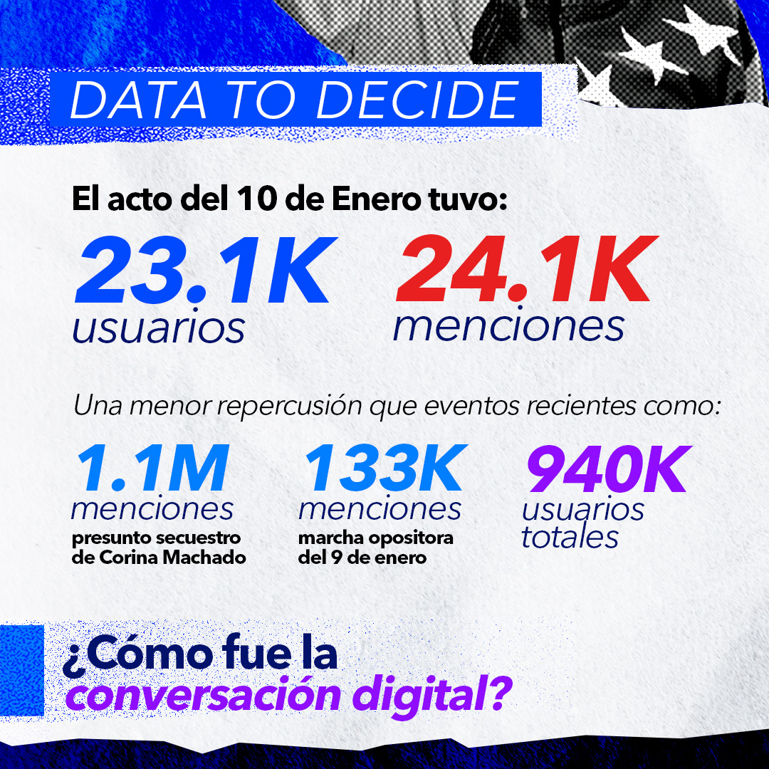 No obstante, en términos de repercusión digital, la jura presidencial tuvo un impacto considerablemente menor en comparación con otros eventos recientes, como las movilizaciones opositoras del 9 de enero [133K] y el presunto secuestro de la dirigente María Corina Machado [1.1M]. Más de 940K de usuarios participaron de la conversación sobre estos dos acontecimientos que ocurrieron justo un día antes de la asunción y captaron la atención del mundo.