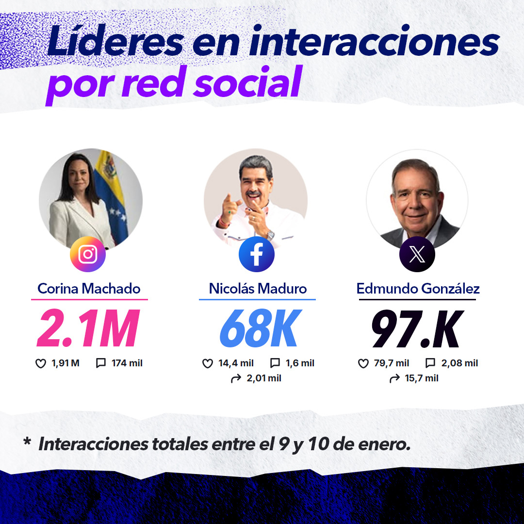 En cuanto a quiénes dominaron la conversación en las 3 principales redes sociales tenemos a Maria Corina en Instagram, a Nicolás Maduro en Facebook y a Edmundo Gonzalez en X.